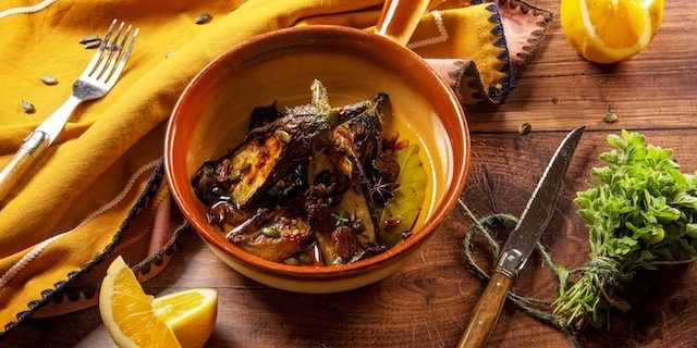 Μελιτζάνες με σταφίδες και κουκουνάρι μια συνταγή στα πρότυπα της Πυθαγόρειας προτροπής από το εξαιρετικό βιβλίο της Μαργαρίτας Ικαρίου
