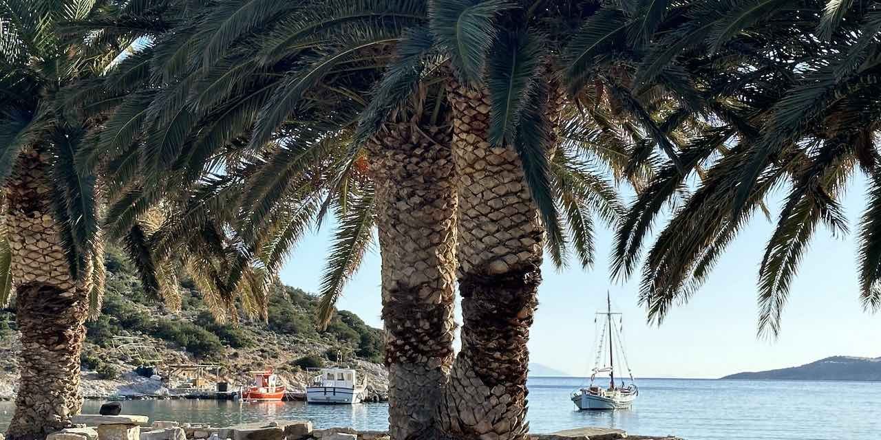 Η παραλία με τους φοίνικες της Νάξου κόντρα στο κυκλαδίτικο τοπίο του Αιγαίου.